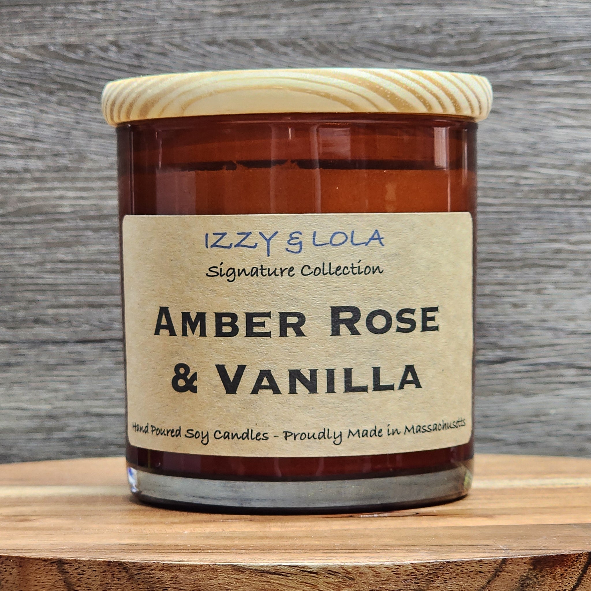 Our Candles feature an Amber glass tumbler that measures 3.5" tall with a diameter of 3" and is topped with a natural unfinished pine wood lid.